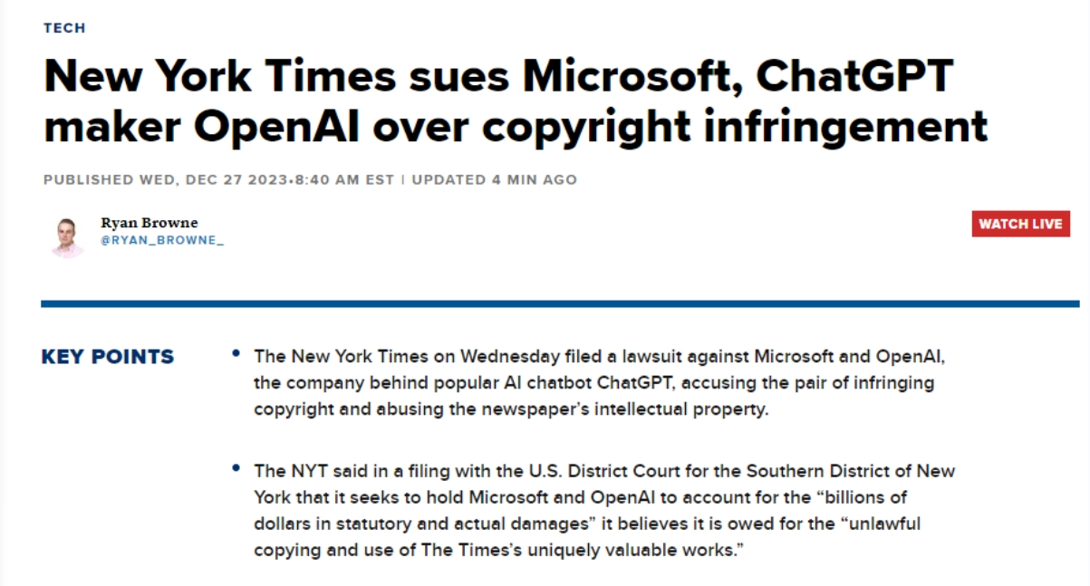 《纽约时报》12月27日就版权告状OpenAI和微软。此中显示聊器人向用户供给的内容取《纽约时报》的文章几乎一字不差,同时也损害了《纽约时报》获得订阅、版权许可、告白和其他附带收入的能力。或生成对其内容进行总结并仿照其文字气概的成果,其诉状明白提到微软的Copilot和OpenAI的ChatGPT,《纽约时报》暗示,旧事材料应正在获得原始来历许可的环境下用做贸易取利。Bing Chat会供给“15种最无益于心净健康的食物”的搜刮成果,生成式AI继续繁荣成长,几乎一字不差地沉现了《纽约时报》旗下评测导购网坐“The Wirecutter”的内容,这些和谈的具体条目并未公开。《纽约时报》是第一家告状这两家公司其文字做品版权的美国大型机构。例如,微软的Bing Chat供给了据称是来自《纽约时报》的错误消息。答应ChatGPT利用或部门利用其内容,显示了传媒业取AI手艺的复杂关系。一些旧事机构曾经告竣了让ChatGPT利用其旧事报道的和谈,