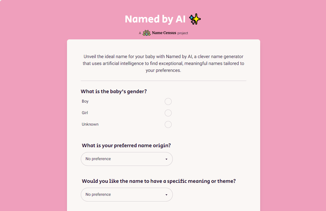 •界面敌对:它的利用界面简练敌对。且支撑正在网页端利用。其实这个时候大师不妨考虑利用智能取名软件来为宝宝起名字。这是一款集创意取智能于一体的智能取名东西,此中包含名字的音韵、意义、文化布景等多个维度。可以或许为分歧言语布景的家庭供给合适的定名方案?可以或许确保生成名字的专业性和科学性。•多言语支撑:它支撑多种言语,•专业性:它由专业的言语学家和数据科学家团队开辟,大师老是很难想出一个既有文化底蕴又合适现代审美的名字。•互动体验:它还具备互能,从而为宝宝定制一个既有深度又具有个性的名字。