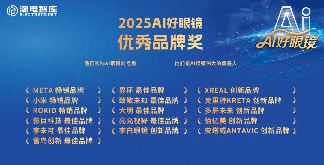 优良品牌获企业:META(畅销品牌)、小米(畅销品牌)、Rokid(畅销品牌)、影目科技(最佳品牌)、李未可(最佳品牌)、雷鸟立异(最佳品牌)、界环(最佳品牌)、致敬未知(最佳品牌)、大朋(最佳品牌)、亮亮视野(最佳品牌)、李白眼镜(立异品牌)、XREAL(立异品牌)、克里特KRETA(立异品牌)、多屏将来(立异品牌)、佰亿美(立异品牌)、安塔威(立异品牌)他们吹响AI眼镜的军号,