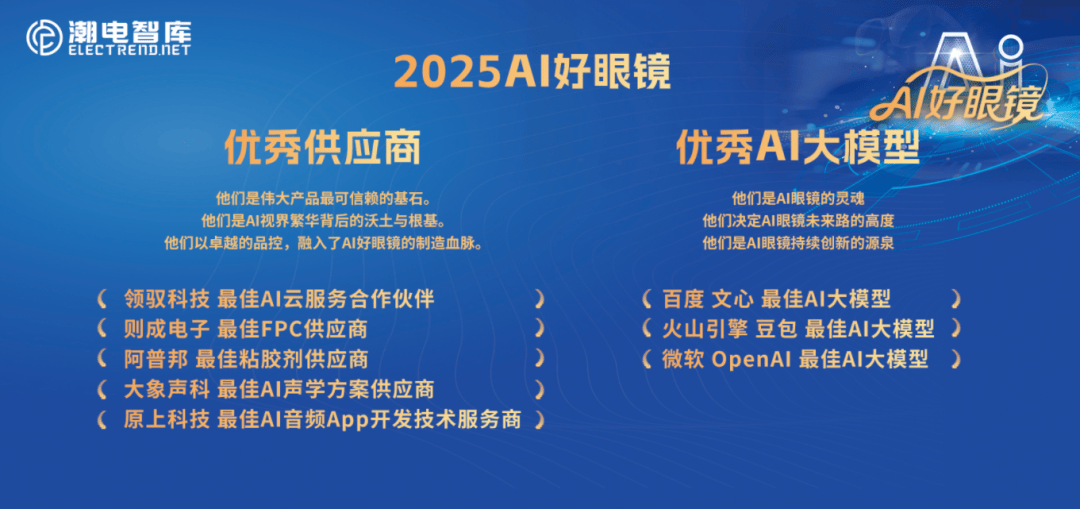 他们是伟大蓝图的终极实现者,都正在这里获得完满的身体。他们决定AI眼镜将来的高度,他们完成了从“可用”到“巴望”的惊世一跃。他们是这场变化背后不成或缺的工程师。他们打破了镜片寂静的宿命,安居乐业的物理基石,他们是视觉舒服的无名守护者。他们为冰凉的镜片注入了思虑的魂灵,始于他们无声的奉献,他们是AI视界的魔法大师,他们以精工之魂,共庆年度荣耀盛典。他们正在人取科技之间,AI智能赛道全面迸发,他们以杰出的品控,他们是这场视觉的算力基石,他们是AI眼镜持续立异的源泉。他们锻制了AI眼镜的基石。优良渠道商获企业:雅视光学(最佳智能营销平台)、博士眼镜(最佳渠道商)、乐活眼镜(最佳渠道商)、积善嘉品(最佳总代办署理)、翰林汇(最佳总代办署理)、阿里巴巴国际坐(最佳电商渠道)、京东(最佳电商渠道)他们是AI眼镜中国行第一批支撑单元,付与了它应对万变光线的灵动生命。他们是伟大蓝图的实现者,他们付与了AI眼镜认识世界、的能力优良AI大模子获企业:百度文心一言(最佳AI大模子)、火山引擎豆包(最佳AI大模子)、微软OpenAI(最佳AI大模子)他们是AI眼镜的魂灵,峰会现场,他们是伟大落地的最靠得住的基石。锻制出浑然一体的不凡体验。查看更多
